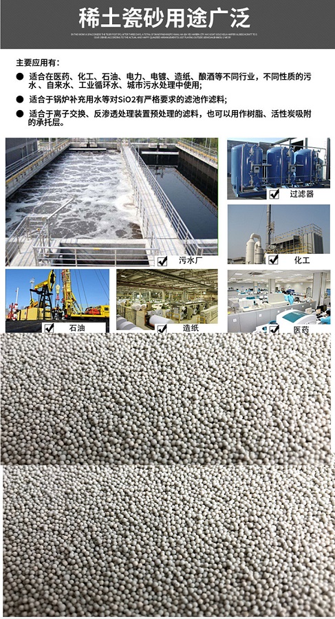 瓷砂濾料是一種球形顆粒,具有很好的穩(wěn)定化學(xué)性能,強(qiáng)度高,耐高溫 耐腐蝕比表面積大,截污吸附性能好,顆粒均勻,比重適中。稀土瓷砂濾料含油增強(qiáng)及耐腐蝕性的稀土,具有瓷砂濾料的性能外,吸附性能增強(qiáng),化學(xué)穩(wěn)定性能好,適合做反滲透過濾和超濾介質(zhì)。 在單層濾池  雙層濾池 雙層過濾器,離子交換器等過濾上班中作過濾介質(zhì)及墊層,可以處理各種工業(yè)污水 工業(yè)用水 城市污水等。