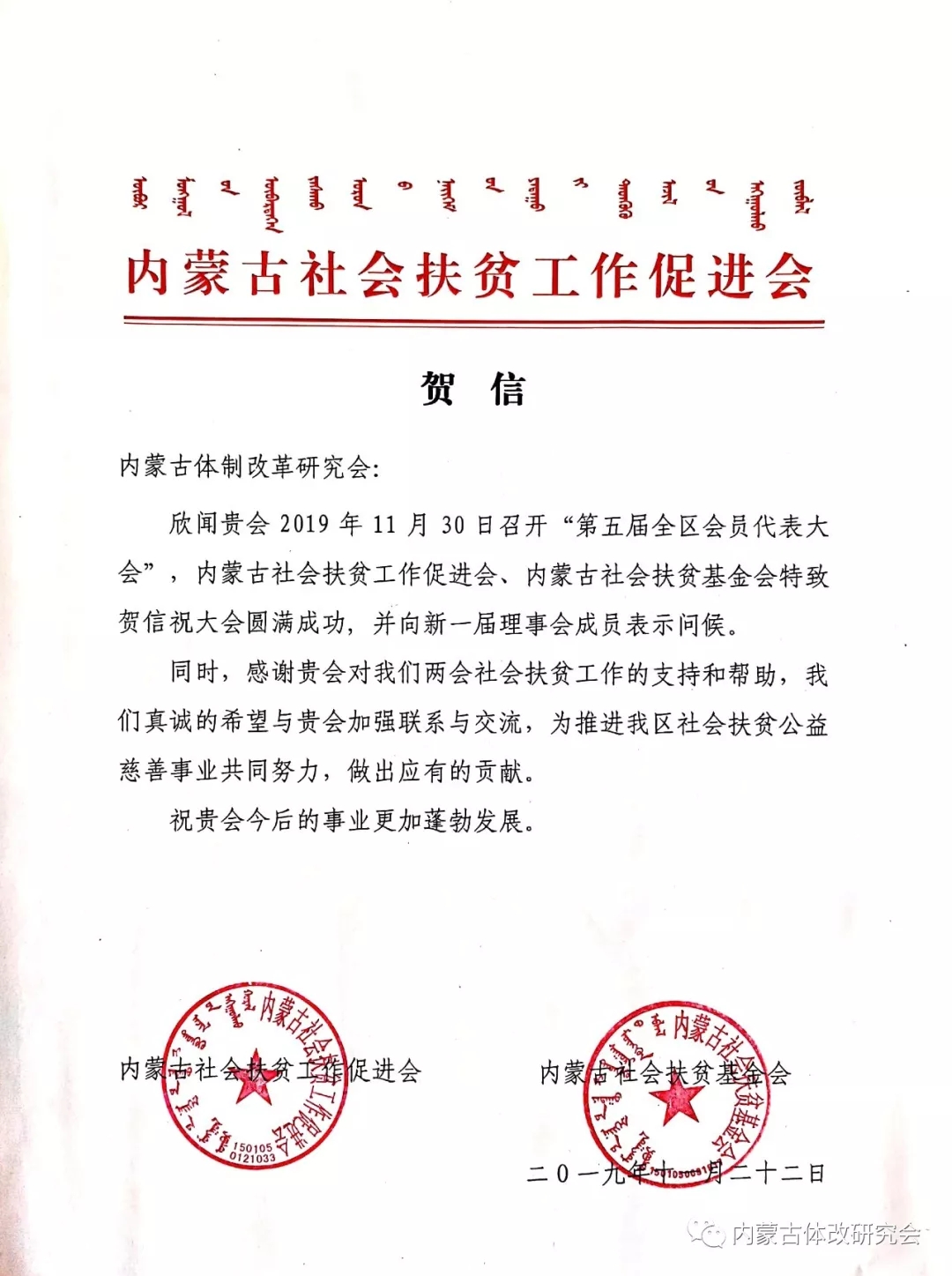 內(nèi)蒙古社會扶貧工作促進會、內(nèi)蒙古社會扶貧基金會發(fā)來賀信