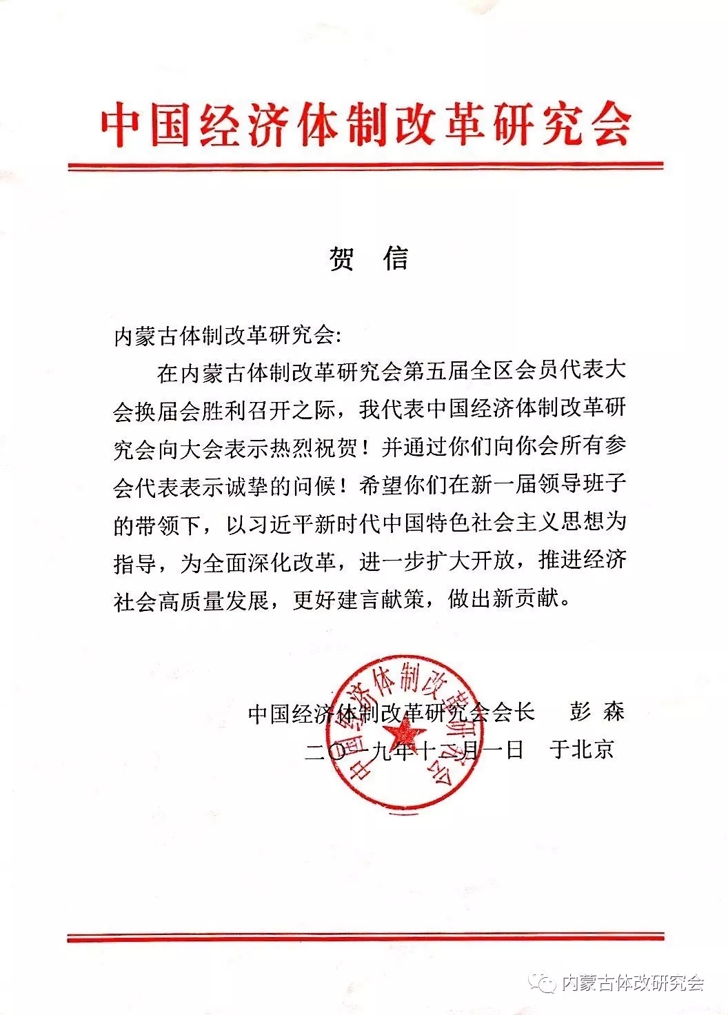 中國體制改革研究會發(fā)來賀信
