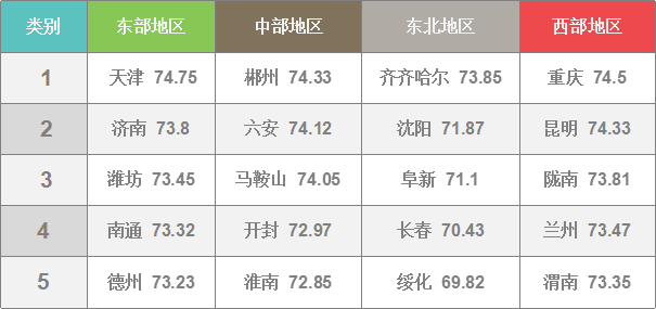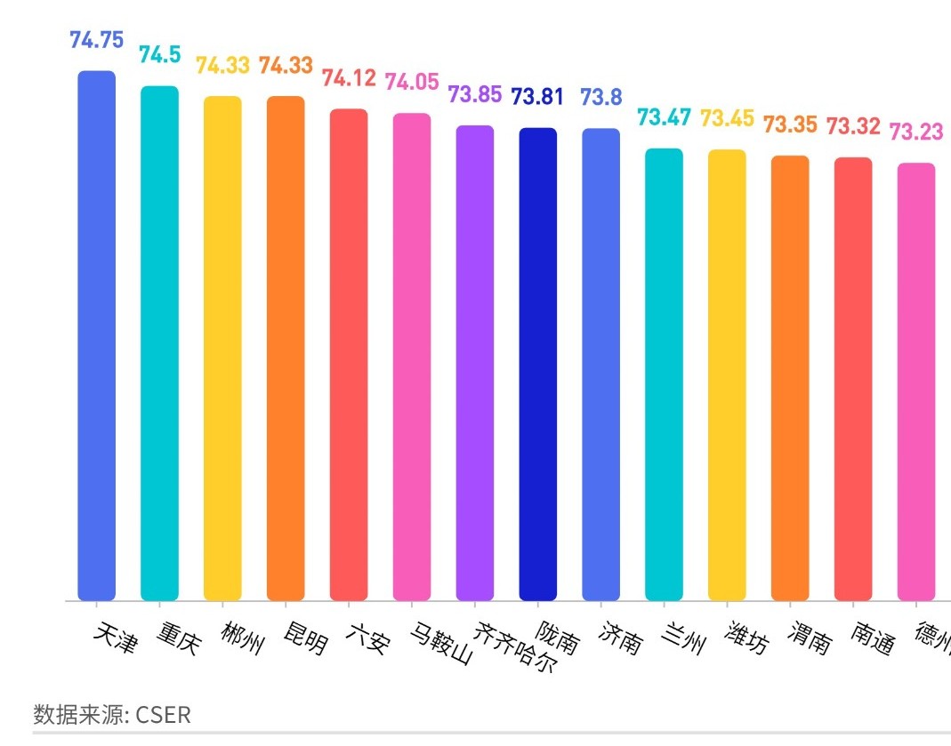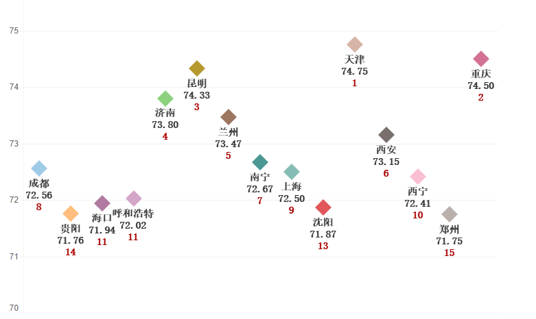 天津74.75,重慶74.5,濟(jì)南73.8,西安73.15,青島73.03,成都72.56,上海72.5,深圳72.19,沈陽71.87,杭州70.71,北京70.5,長春70.43,廣州69.36,寧波69.07,武漢69.02,哈爾濱68.48,大連67.34,南京66.81,廈門64.32。