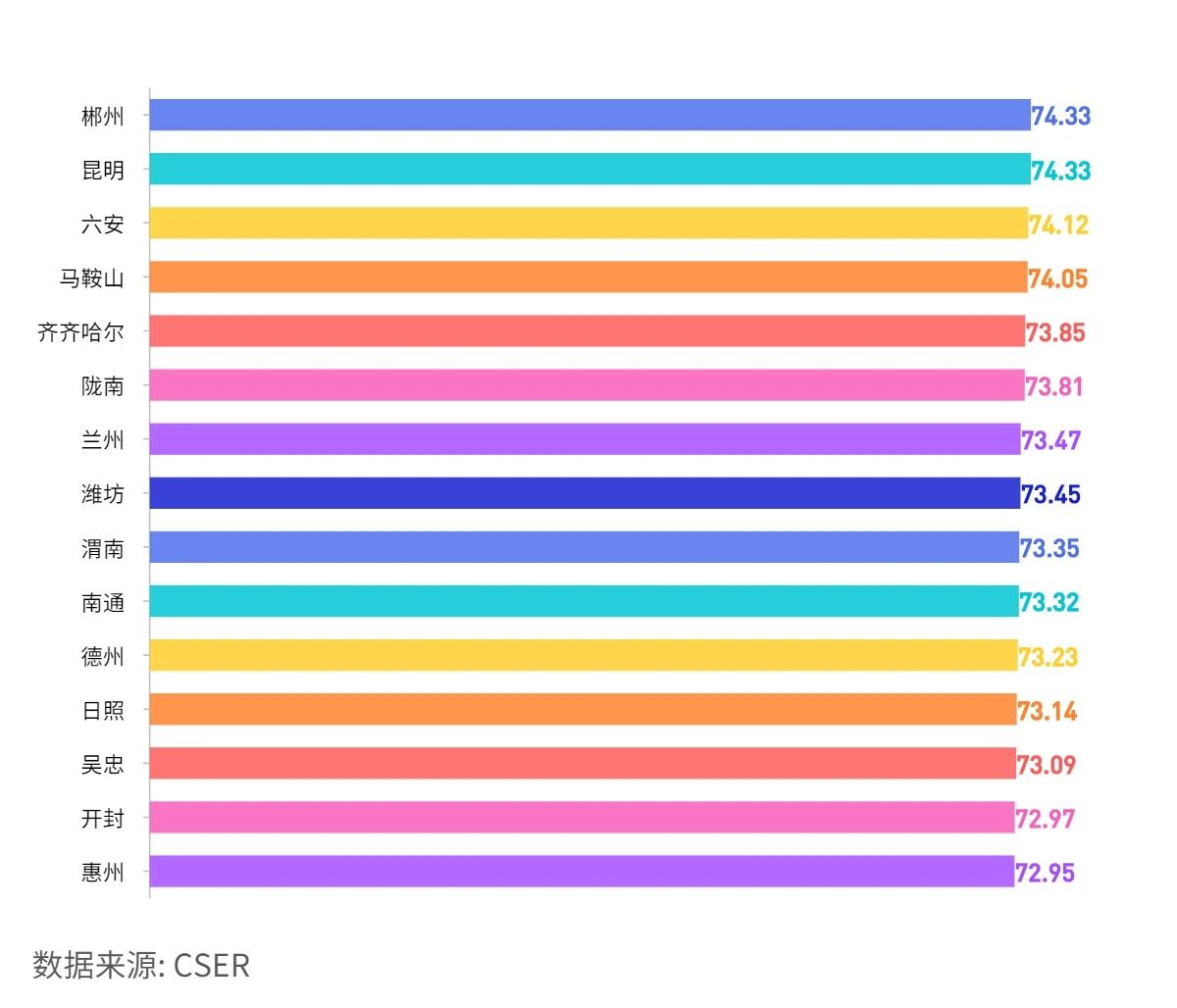 相比較上一季度,昆明、六安、馬鞍山、齊齊哈爾排名均有上升,南通、隴南排名下降。郴州、蘭州、濰坊、渭南、德州、日照、吳忠、開封、惠州躋身TOP15,鄭州、晉城、長治、防城港、濮陽、滁州、鎮(zhèn)江、保定則跌出TOP15。