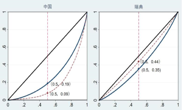 資料來源:中國(guó)的曲線根據(jù)CHIPS2018年調(diào)查數(shù)據(jù)計(jì)算繪制。瑞典的曲線根據(jù)Nieuwenhuis,Nelson和Alm在2020年發(fā)表論文中2003年的基尼系數(shù)與集中度的數(shù)據(jù)模擬繪制。