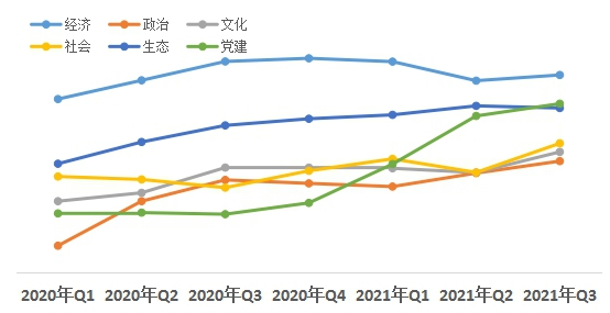 從近幾個(gè)季度的評估結(jié)果來看,經(jīng)濟(jì)領(lǐng)域熱度值領(lǐng)先其他領(lǐng)域;黨建領(lǐng)域熱度值從2020年第三季度開始穩(wěn)步上升,且增幅高于文化、社會(huì)等領(lǐng)域;政治領(lǐng)域改革熱度值從今年一季度以來持續(xù)呈上升趨勢。