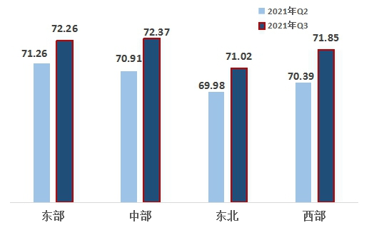 2、從區(qū)域來看,西部、中部地區(qū)熱度指數(shù)增長明顯。東、中、東北、西部改革熱度指數(shù)分別為72.26、72.37、71.02、71.85。中部地區(qū)超越東部地區(qū)位列第一,西部地區(qū)超越東北地區(qū)位居第三,東北地區(qū)最后。四大區(qū)域均比上一季度有所上升。其中,西部、中部地區(qū)的增幅較大。