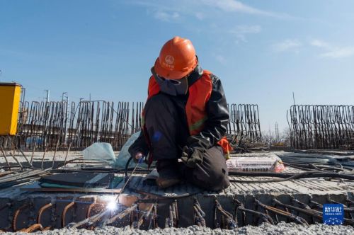 4月3日,在哈爾濱市道外區(qū),工人在中鐵一局北門街高架工程施工現(xiàn)場作業(yè)。新華社記者 謝劍飛 攝