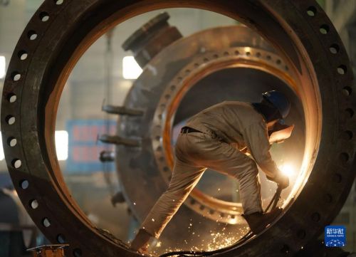 4月14日,在哈電集團哈爾濱鍋爐廠有限責任公司車間,工人進行生產(chǎn)作業(yè)。新華社記者 王建威 攝