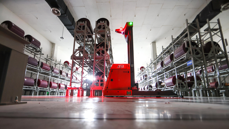 5月17日,AGV(自動導(dǎo)引運(yùn)輸車)穿行在貴州首個(gè)5G全連接工廠的部件生產(chǎn)區(qū)內(nèi)。新華社記者 歐東衢 攝