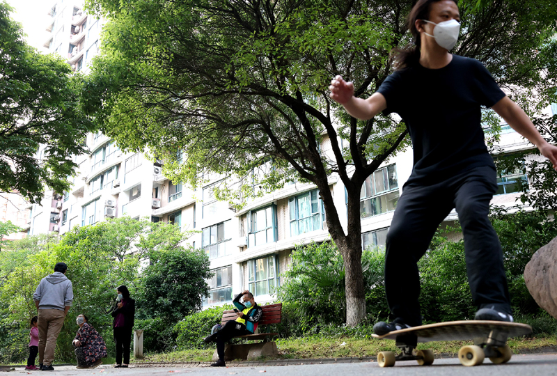 5月17日,市民在上海市普陀區(qū)的一個(gè)居民小區(qū)內(nèi)享受休閑一刻。新華社記者 陳飛 攝