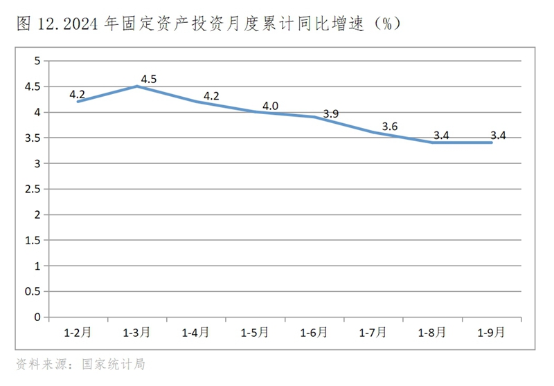 (二)投資增速持續(xù)回落更為明顯,9月份保持穩(wěn)定。1-2月份固定資產(chǎn)投資同比增長4.2%,1-3月份增速回升到今年以來的最高增速的4.5%,自此以后持續(xù)回落,到8月份回落到3.4%,9月份保持穩(wěn)定,與8月份增速持平。