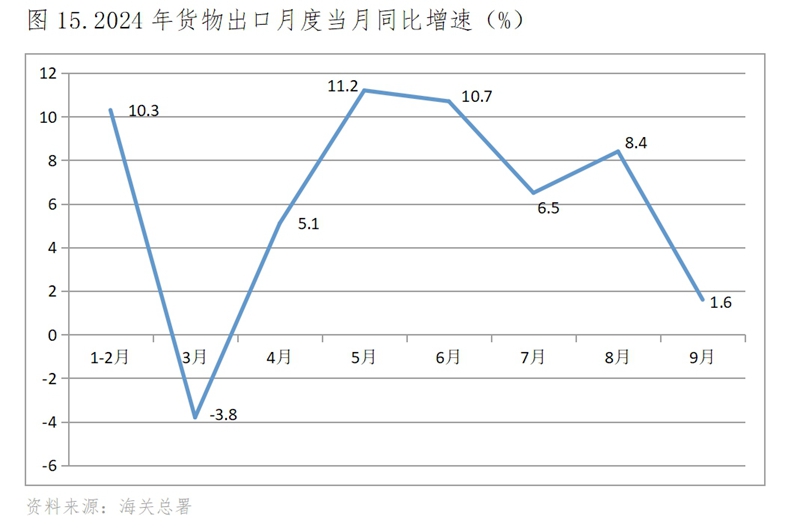 (五)出口增速在較大波動(dòng)中出現(xiàn)放緩,9月份回落。今年以來的出口增速波動(dòng)還不小,1-2月份出口同比增長10.3%,3月份下降3.8%,隨后保持了兩個(gè)月增速的回升,自6月份增速開始波動(dòng)回落,到9月份回落到增長1.6%。