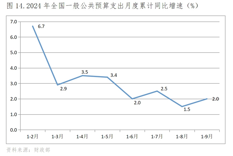 (五)財(cái)政支出增速比上年同期回落。1-9月份一般公共預(yù)算支出同比增長2.0%,比上年同期增長3.9%回落1.9個(gè)百分點(diǎn)。其中,支出占比較高的社會(huì)保障和就業(yè)支出同比增長4.3%,教育支出增長1.1%,農(nóng)林水支出增長6.4%,城鄉(xiāng)社區(qū)支出增長6.1%,住房保障支出增長2.5%。