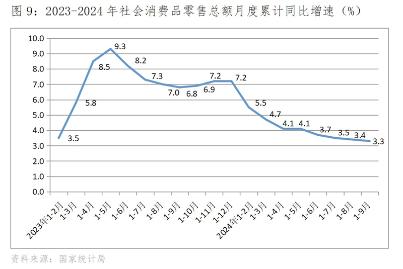 (四)零售增速比上年同期回落。1-9月份社會(huì)消費(fèi)品零售總額同比增長3.3%,比上年同期增長6.8%回落3.5個(gè)百分點(diǎn)。其中,城鎮(zhèn)消費(fèi)品零售額同比增長3.2%,鄉(xiāng)村消費(fèi)品零售額增長4.4%;增速超過9.0%的通訊器材類增長11.9%,糧油、食品類增長9.9%,體育、娛樂用品類增長9.7%。
