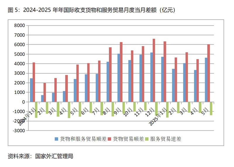 (四)國(guó)際收支貨物和服務(wù)貿(mào)易順差持續(xù)增加。今年1月份國(guó)際收支貨物和服務(wù)貿(mào)易順差比上年同月增加2252億元;2月份順差增加2735億元,3月順差增加3093億元,4月順差增加2199億元,5月順差增加2249億元,國(guó)際收支貨物和服務(wù)貿(mào)易順差比上年同期有著明顯的增加。在美國(guó)“對(duì)等關(guān)稅”政策的沖擊下,國(guó)際收支貨物和服務(wù)貿(mào)易仍實(shí)現(xiàn)較大的順差,足以說(shuō)明我國(guó)經(jīng)濟(jì)有著較強(qiáng)的國(guó)際競(jìng)爭(zhēng)力。