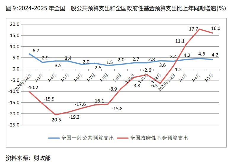 (四)一般公共預(yù)算支出增速與一季度持平、比上年同期回升,政府性基金預(yù)算支出增速比一季度回升、由上年同期下降轉(zhuǎn)為增長(zhǎng)。1-5月份全國(guó)一般公共預(yù)算支出同比增長(zhǎng)4.2%,與一季度增長(zhǎng)4.2%持平,比上年同期增長(zhǎng)3.4%回升了0.8個(gè)百分點(diǎn),但增速仍有一些偏慢;全國(guó)政府性基金預(yù)算支出同比增長(zhǎng)16.0%,比一季度增長(zhǎng)11.1%回升4.9個(gè)百分點(diǎn),上年同期為下降19.3%,呈現(xiàn)出明顯回升的態(tài)勢(shì)。從拉動(dòng)經(jīng)濟(jì)增長(zhǎng)的要求看,特別是在面對(duì)微觀經(jīng)營(yíng)主體需求不足的形勢(shì)下,政府支出還需要更快一些,有必要進(jìn)一步加大政府支出的力度。