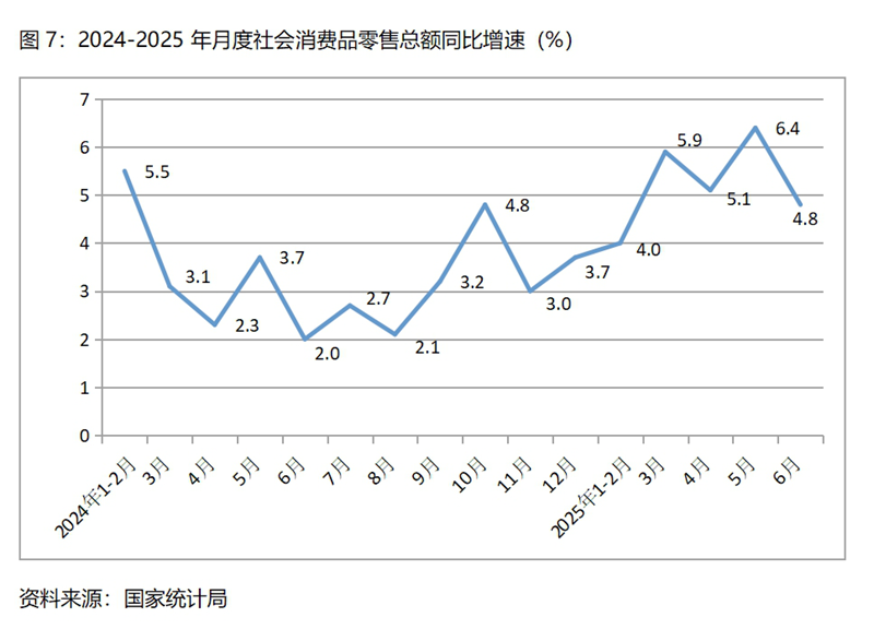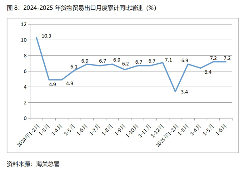 下半年GDP保持4.8%以上的增速,有政策實(shí)施、有趨勢(shì)慣性以及上年穩(wěn)定基數(shù)等因素的支撐。上半年積極的財(cái)政政策通過(guò)擴(kuò)大支出、適度寬松貨幣政策通過(guò)降準(zhǔn)降息、擴(kuò)大內(nèi)需通過(guò)設(shè)備更新和以舊換新等政策措施,在下半年將會(huì)繼續(xù)發(fā)揮作用,加之下半年積極財(cái)政政策和適度寬松貨幣政策的繼續(xù)實(shí)施,“兩重”、“兩新”政策等一系列政策措施的落實(shí),對(duì)下半年經(jīng)濟(jì)增長(zhǎng)形成了有力支持。上半年GDP的較快增長(zhǎng),對(duì)下半年GDP增長(zhǎng)發(fā)揮著慣性的作用,加之下半年GDP增長(zhǎng)基數(shù)與上半年基數(shù)均是5.0%,穩(wěn)定的基數(shù)有利于下半年GDP增長(zhǎng)4.8%以上。