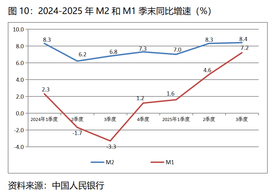 圖10:2024-2025年M2和M1季末同比增速(%)