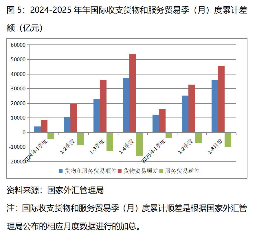 圖5:2024-2025年年國(guó)際收支貨物和服務(wù)貿(mào)易季(月)度累計(jì)差額(億元)