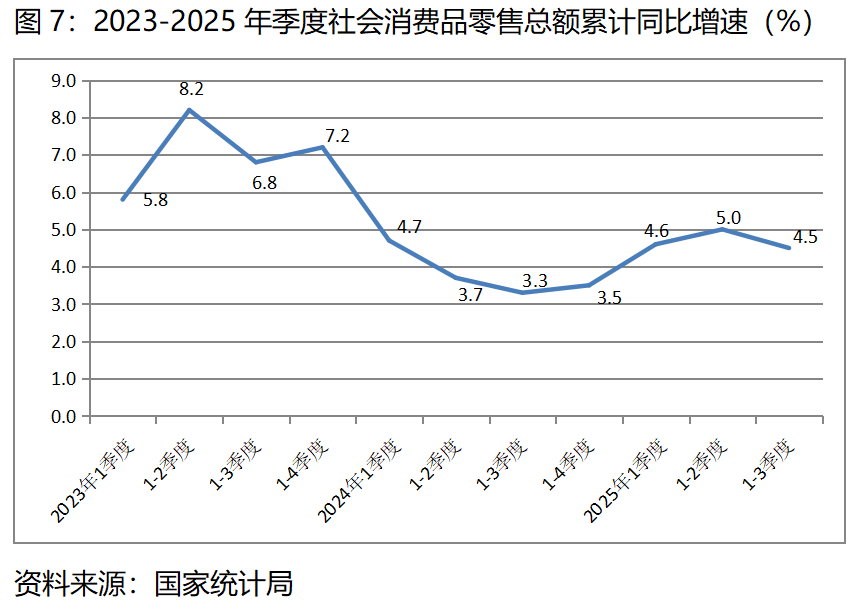 圖7:2023-2025年季度社會(huì)消費(fèi)品零售總額累計(jì)同比增速(%)