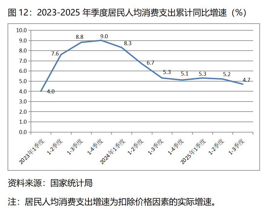 圖12:2023-2025年季度居民人均消費(fèi)支出累計(jì)同比增速(%)
