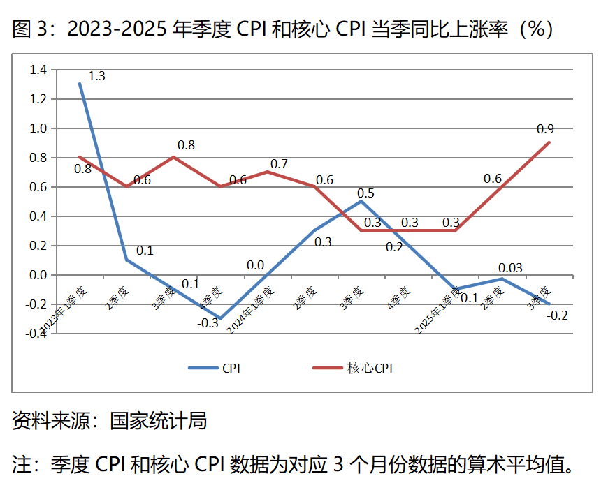 圖3:2023-2025年季度CPI和核心CPI當(dāng)季同比上漲率(%)
