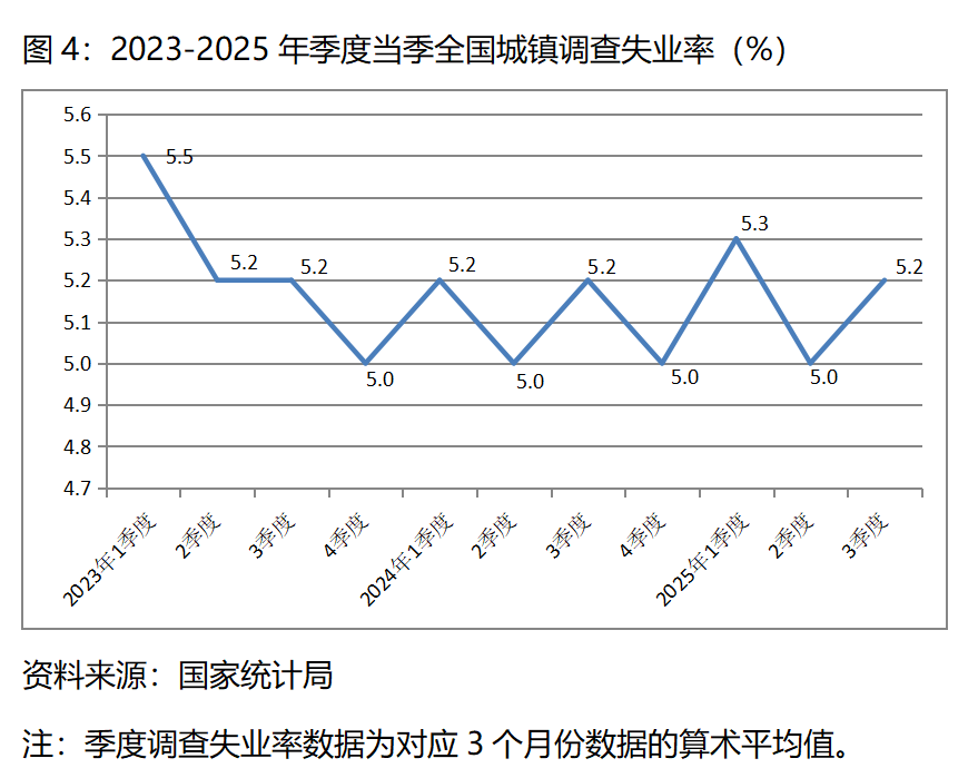 圖4:2023-2025年季度當(dāng)季全國(guó)城鎮(zhèn)調(diào)查失業(yè)率(%)