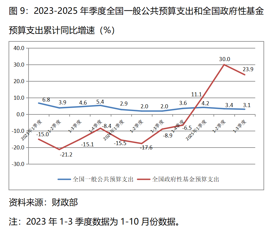 圖9:2023-2025年季度全國(guó)一般公共預(yù)算支出和全國(guó)政府性基金預(yù)算支出累計(jì)同比增速(%)