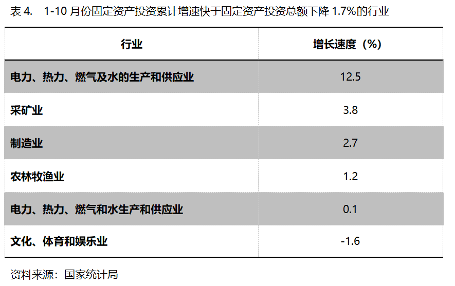 1-10月份,固定資產(chǎn)投資累計(jì)增速快于固定資產(chǎn)投資總額下降1.7%的行業(yè)共6個(gè),即電力、熱力、燃?xì)饧八纳a(chǎn)和供應(yīng)業(yè)增長(zhǎng)12.5%,采礦業(yè)增長(zhǎng)3.8%,制造業(yè)增長(zhǎng)2.7%。農(nóng)林牧漁業(yè)增長(zhǎng)1.2%,交通運(yùn)輸、倉(cāng)儲(chǔ)和郵政業(yè)增長(zhǎng)0.1%,文化、體育和娛樂業(yè)下降1.6%。