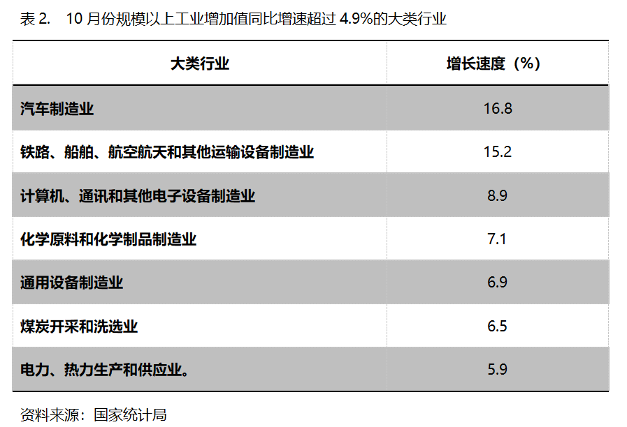 10月份,增長(zhǎng)速度超過(guò)規(guī)模以上工業(yè)增長(zhǎng)4.9%的主要大類行業(yè)共有7個(gè),即汽車制造業(yè)增長(zhǎng)16.8%,鐵路、船舶、航空航天和其他運(yùn)輸設(shè)備制造業(yè)同比增長(zhǎng)15.2%,計(jì)算機(jī)、通訊和其他電子設(shè)備制造業(yè)增長(zhǎng)8.9%,化學(xué)原料和化學(xué)制品制造業(yè)增長(zhǎng)7.1%,通用設(shè)備制造業(yè)增長(zhǎng)6.9%,煤炭開采和洗選業(yè)增長(zhǎng)6.5%,電力、熱力生產(chǎn)和供應(yīng)業(yè)增長(zhǎng)5.9%。