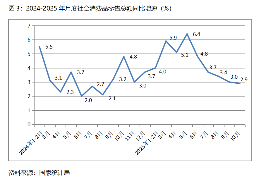 三、零售增速持續(xù)回落。10月份,社會(huì)消費(fèi)品零售總額同比增長(zhǎng)2.9%,比9月份增長(zhǎng)3.0%回落了0.1個(gè)百分點(diǎn),9月份比8月份增長(zhǎng)3.4%回落了0.4個(gè)百分點(diǎn),其中,餐飲收入增速回升,商品零售額增速回落,10月份餐飲收入同比增長(zhǎng)3.8%,比9月份增長(zhǎng)0.9%回升了2.9個(gè)百分點(diǎn);商品零售額增長(zhǎng)2.8%,比9月份增長(zhǎng)3.3%回落0.5個(gè)百分點(diǎn)。10月份社會(huì)消費(fèi)品零售總額增速是今年以來(lái)月份的最低增速。