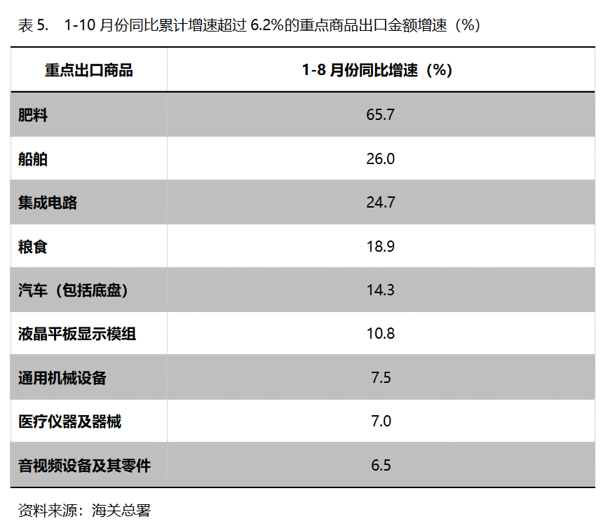 1-10月份,出口金額同比增速超過(guò)6.2%的重點(diǎn)商品共有9類,即肥料出口增長(zhǎng)65.7%,船舶增長(zhǎng)26.0%,集成電路增長(zhǎng)24.7%,糧食增長(zhǎng)18.9%,汽車(包括底盤)增長(zhǎng)14.3%,液晶平板顯示模組增長(zhǎng)10.8%,通用機(jī)器設(shè)備增長(zhǎng)7.5%,醫(yī)療儀器及器械增長(zhǎng)7.0%,音視頻設(shè)備及其零件增長(zhǎng)6.5%。