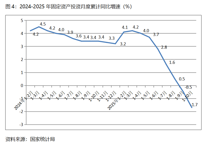 四、投資增速持續(xù)下降。1-10月份,固定資產(chǎn)投資總額同比下降1.7%,比1-9月份下降0.5%擴(kuò)大了1.2個(gè)百分點(diǎn),1-9月份增速由1-8月份增長(zhǎng)0.5%轉(zhuǎn)為下降0.5%,增速由年初以來(lái)的持續(xù)回落轉(zhuǎn)為連續(xù)兩個(gè)月的下降。1-10月份國(guó)有控股投資同比增長(zhǎng)0.1%,比1-9月份增長(zhǎng)1.0%回落0.9個(gè)百分點(diǎn);民間投資下降4.5%,比1-9月份下降3.1%擴(kuò)大了1.4個(gè)百分點(diǎn)。三次產(chǎn)業(yè)投資中,第一產(chǎn)業(yè)投資同比增長(zhǎng)2.9%,比1-9月份增長(zhǎng)4.6%回落1.7個(gè)百分點(diǎn);第二產(chǎn)業(yè)投資增長(zhǎng)4.8%,比1-9月份增長(zhǎng)6.3%回落1.5個(gè)百分點(diǎn);第三產(chǎn)業(yè)投資下降5.3%,比1-9月份下降4.3%擴(kuò)大1.0 百分點(diǎn)。固定資產(chǎn)投資增速自年初以來(lái)持續(xù)回落轉(zhuǎn)為近兩個(gè)月的持續(xù)下降,呈現(xiàn)出投資后勁乏力的苗頭。