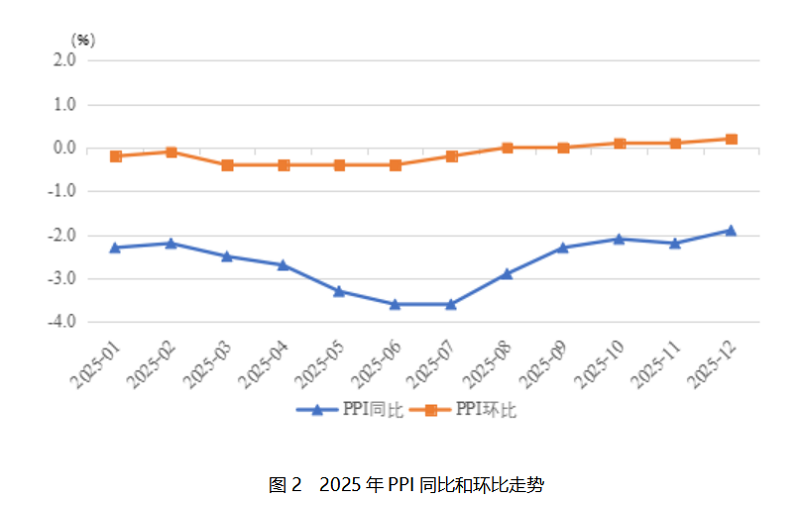 二是PPI呈“V”型走勢(shì),同比繼續(xù)下降。PPI同比下降2.6%,降幅比上年略擴(kuò)大0.4個(gè)百分點(diǎn)。生產(chǎn)資料和生活資料價(jià)格同步走低,且降幅較上年同期均有所擴(kuò)大。其中,生產(chǎn)資料價(jià)格同比下降 3%,降幅較上年擴(kuò)大 0.5 個(gè)百分點(diǎn)。從結(jié)構(gòu)上看,生產(chǎn)資料價(jià)格變動(dòng)呈現(xiàn) “上游降幅更深、下游相對(duì)較小” 的梯度特征。上游采掘業(yè)價(jià)格整體下降9.0%,成為生產(chǎn)資料中降幅最大的品類;中游的原材料工業(yè)價(jià)格同比下降3.4%;主要受終端需求不足、產(chǎn)品同質(zhì)化競(jìng)爭(zhēng)加劇等因素影響,下游的加工工業(yè)價(jià)格同比下降2.4%。生活資料中,食品價(jià)格下降1.6%,降幅比上年擴(kuò)大0.5個(gè)百分點(diǎn);衣著價(jià)格下降0.1%,降幅與上年持平;一般日用品價(jià)格上漲0.8%,漲幅比上年擴(kuò)大0.8個(gè)百分點(diǎn);耐用消費(fèi)品價(jià)格下降3.3%,降幅比上年擴(kuò)大1.1個(gè)百分點(diǎn)。主要能源行業(yè)價(jià)格大幅下降是拖累2025年P(guān)PI走勢(shì)的核心因素。其中,煤炭開采和洗選業(yè)價(jià)格同比下降15.7%,降幅較上年大幅擴(kuò)大7.5個(gè)百分點(diǎn)。原因一是全球煤炭市場(chǎng)供過(guò)于求、國(guó)際煤炭?jī)r(jià)格持續(xù)走低,二是國(guó)內(nèi)煤炭行業(yè)產(chǎn)能優(yōu)化調(diào)整、清潔能源替代進(jìn)程加快,進(jìn)一步壓低了煤炭?jī)r(jià)格;石油和天然氣開采業(yè)價(jià)格同比下降 9.9%,降幅較上年擴(kuò)大9.5個(gè)百分點(diǎn),主要受國(guó)際地緣政治局勢(shì)緩和、全球原油產(chǎn)量增加導(dǎo)致的國(guó)際油價(jià)下行影響,國(guó)內(nèi)成品油價(jià)格聯(lián)動(dòng)調(diào)整,進(jìn)而傳導(dǎo)至上游開采環(huán)節(jié)。上述兩大能源行業(yè)的價(jià)格深度下行,不僅直接拉低了采掘工業(yè)價(jià)格,還通過(guò)產(chǎn)業(yè)鏈傳導(dǎo)影響了原材料工業(yè)、加工工業(yè)乃至部分生活資料的成本與價(jià)格,成為PPI降幅擴(kuò)大的重要因素。?