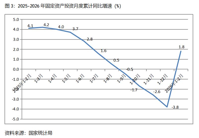 1-2月份,固定資產(chǎn)投資累計增速快于或持平固定資產(chǎn)投資總額增長1.8%的行業(yè)共6個,即農(nóng)林牧漁業(yè)增長16.6%,電力、熱力、燃氣及水的生產(chǎn)和供應業(yè)增長13.1%,采礦業(yè)增長13.0%,交通運輸、倉儲和郵政業(yè)增長9.1%,水利、環(huán)境和公共設(shè)施管理業(yè)增長8.3%,制造業(yè)增長3.1%。