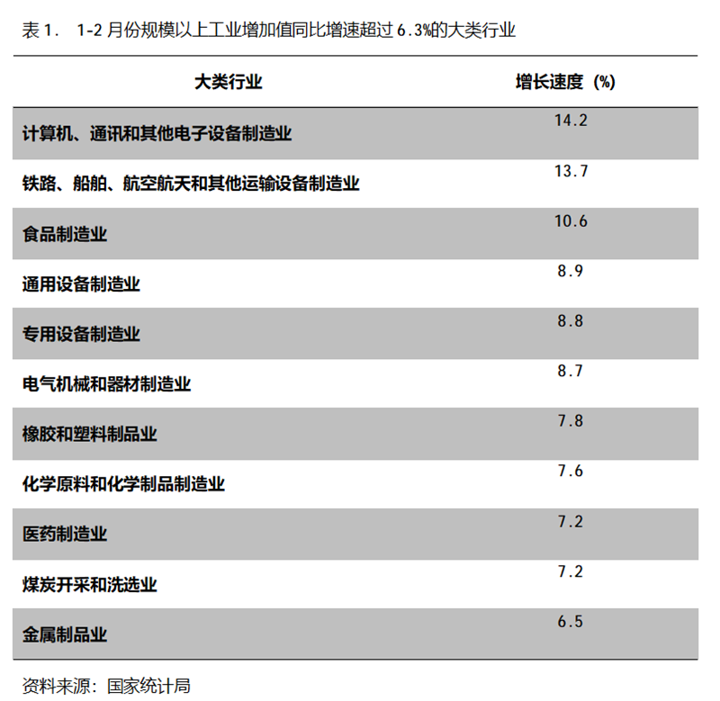 1-2月份,增長速度超過或持平規(guī)模以上工業(yè)增長6.3%的主要大類行業(yè)共有11個,即計算機、通訊和其他電子設(shè)備制造業(yè)增長14.2%,鐵路、船舶、航空航天和其他運輸設(shè)備制造業(yè)增長13.7%,食品制造業(yè)增長10.6%,通用設(shè)備制造業(yè)增長8.9%,專用設(shè)備制造業(yè)增長8.8%,電氣機械和器材制造業(yè)增長8.7%,橡膠和塑料制品業(yè)增長7.8%,化學原料和化學制品制造業(yè)增長7.6%,醫(yī)藥制造業(yè)增長7.2%,煤炭開采和洗選業(yè)增長7.2%,金屬制品業(yè)增長6.5%。