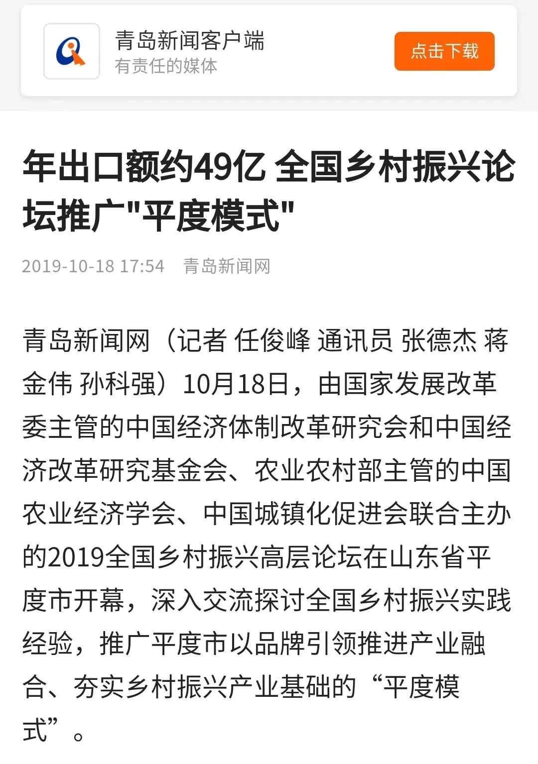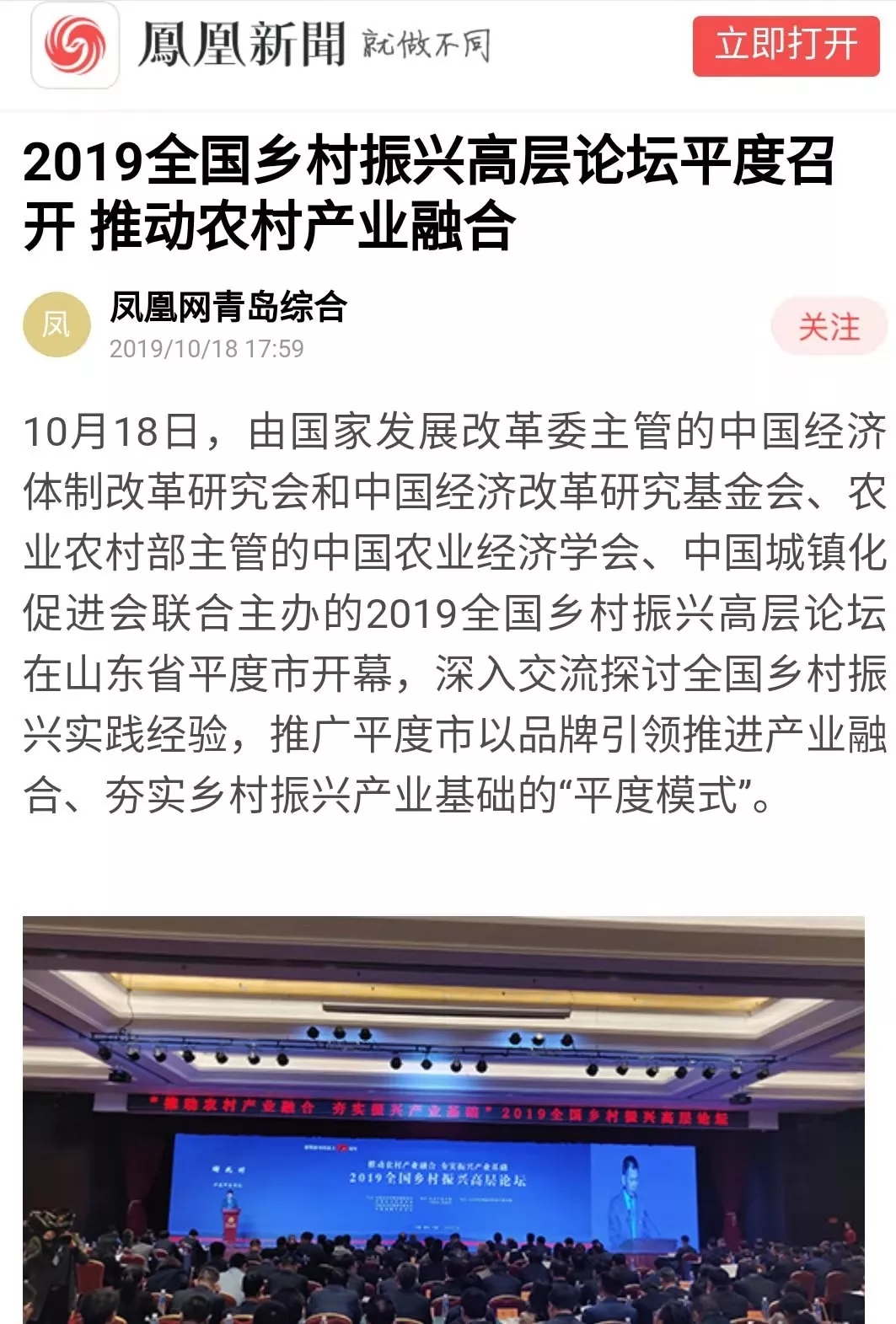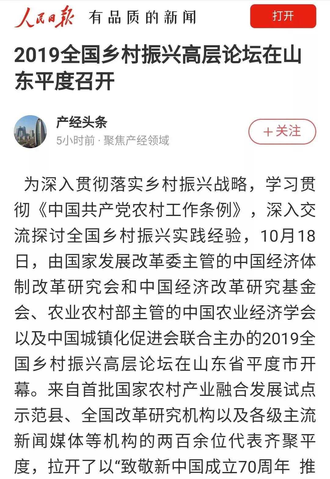 眾媒聚焦丨2019全國鄉(xiāng)村振興高層論壇在平度召開,探討推廣"平度模式"