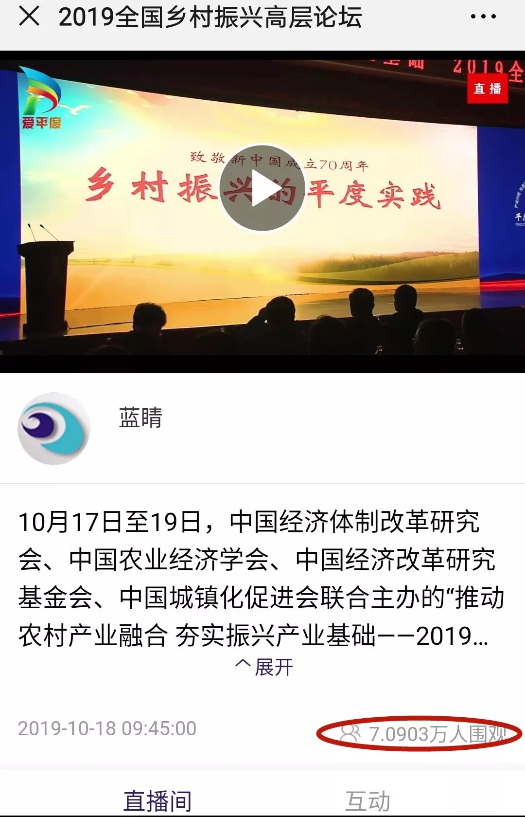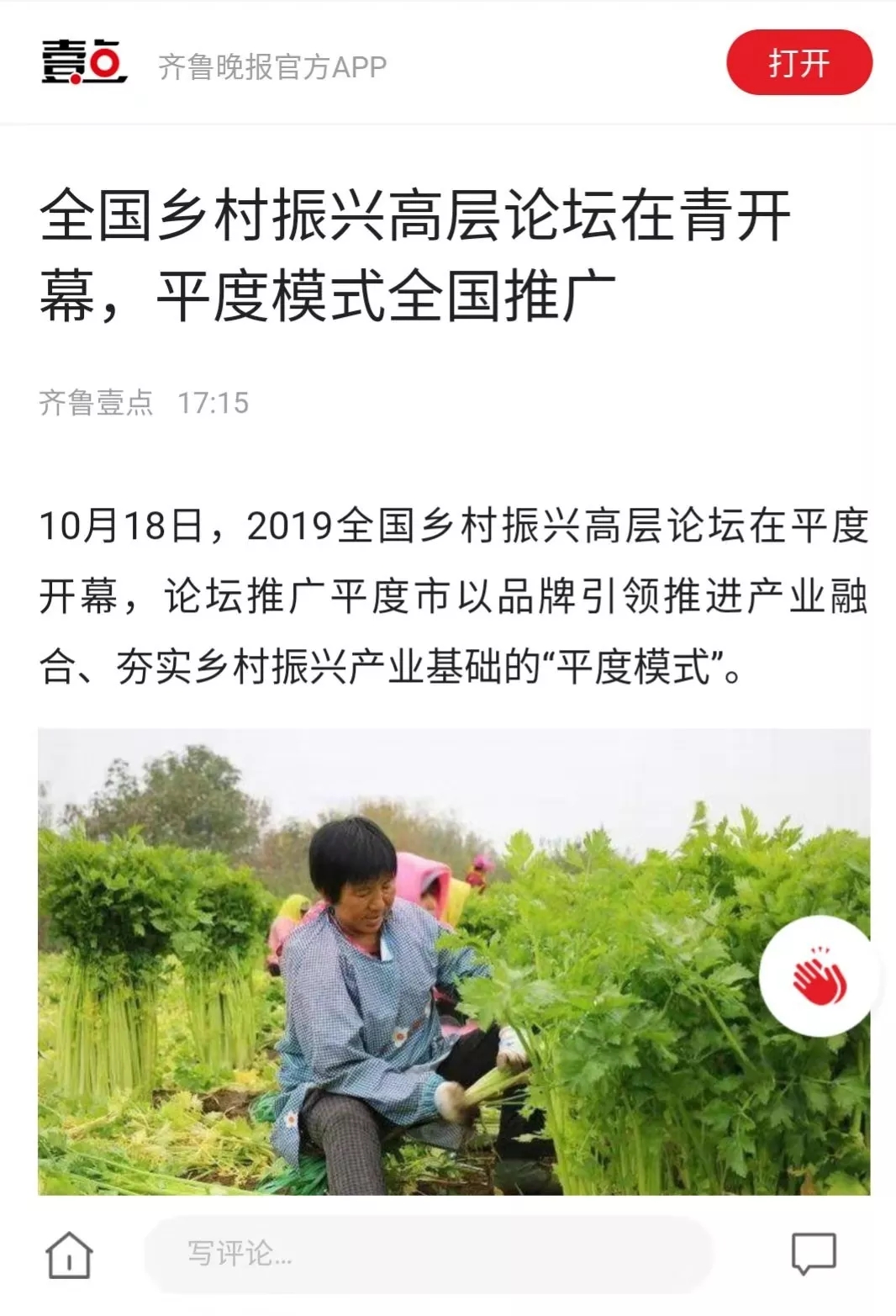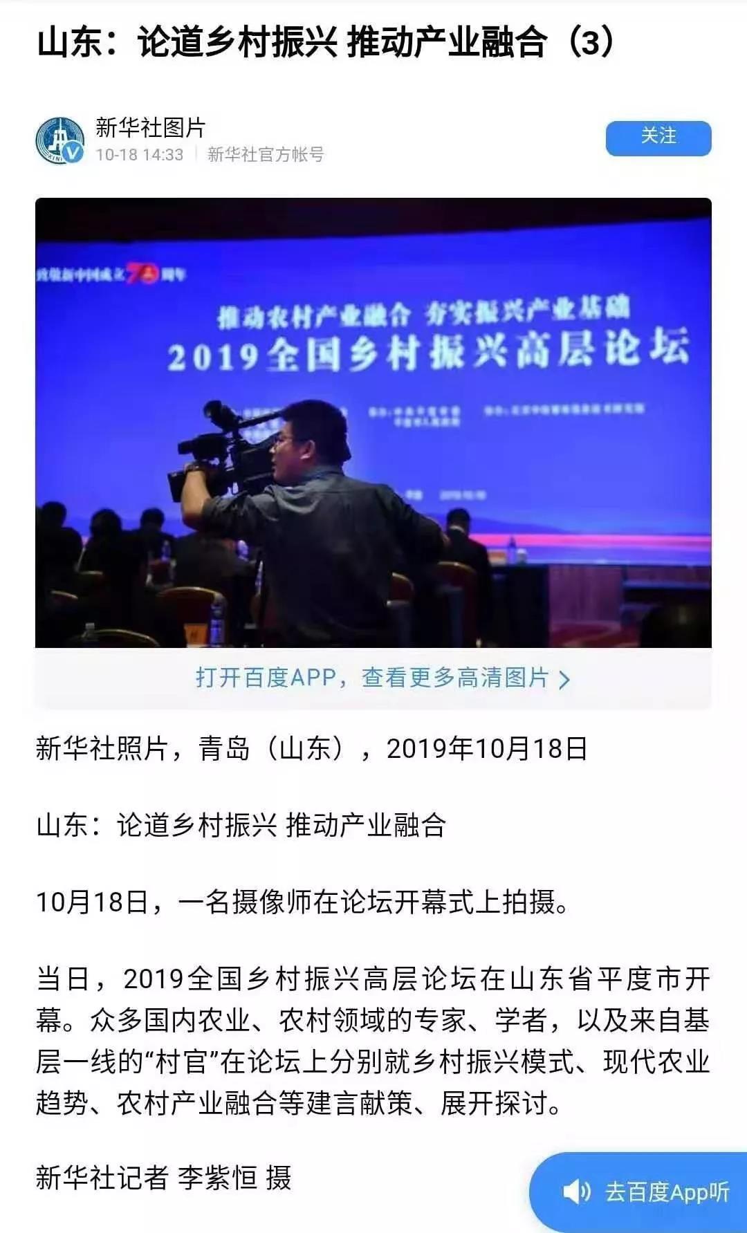 這場在平度舉行的國家級高層論壇受到各級新聞媒體聚焦關(guān)注,中央廣播電視總臺、人民日報、新華社、經(jīng)濟日報、農(nóng)民日報、中國經(jīng)濟時報、山東廣播電視臺、大眾日報、青島廣播電視臺、青島日報等20余家媒體記者到現(xiàn)場采訪報道。1018日上午,青島廣播電視臺藍睛客戶端現(xiàn)場直播論壇盛況,在線觀看已突破7萬人次。目前,新華社、人民網(wǎng)、鳳凰網(wǎng)、青島廣播電視臺、青島日報、齊魯晚報、青島早報、青島晚報、半島都市報、商周刊、大眾網(wǎng)、中國山東網(wǎng)、青島新聞網(wǎng)等10余家媒體第一時間已刊發(fā)相關(guān)報道。